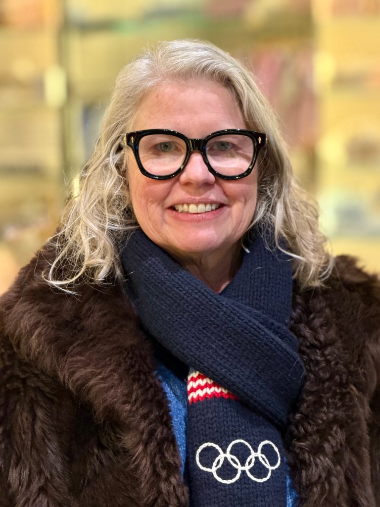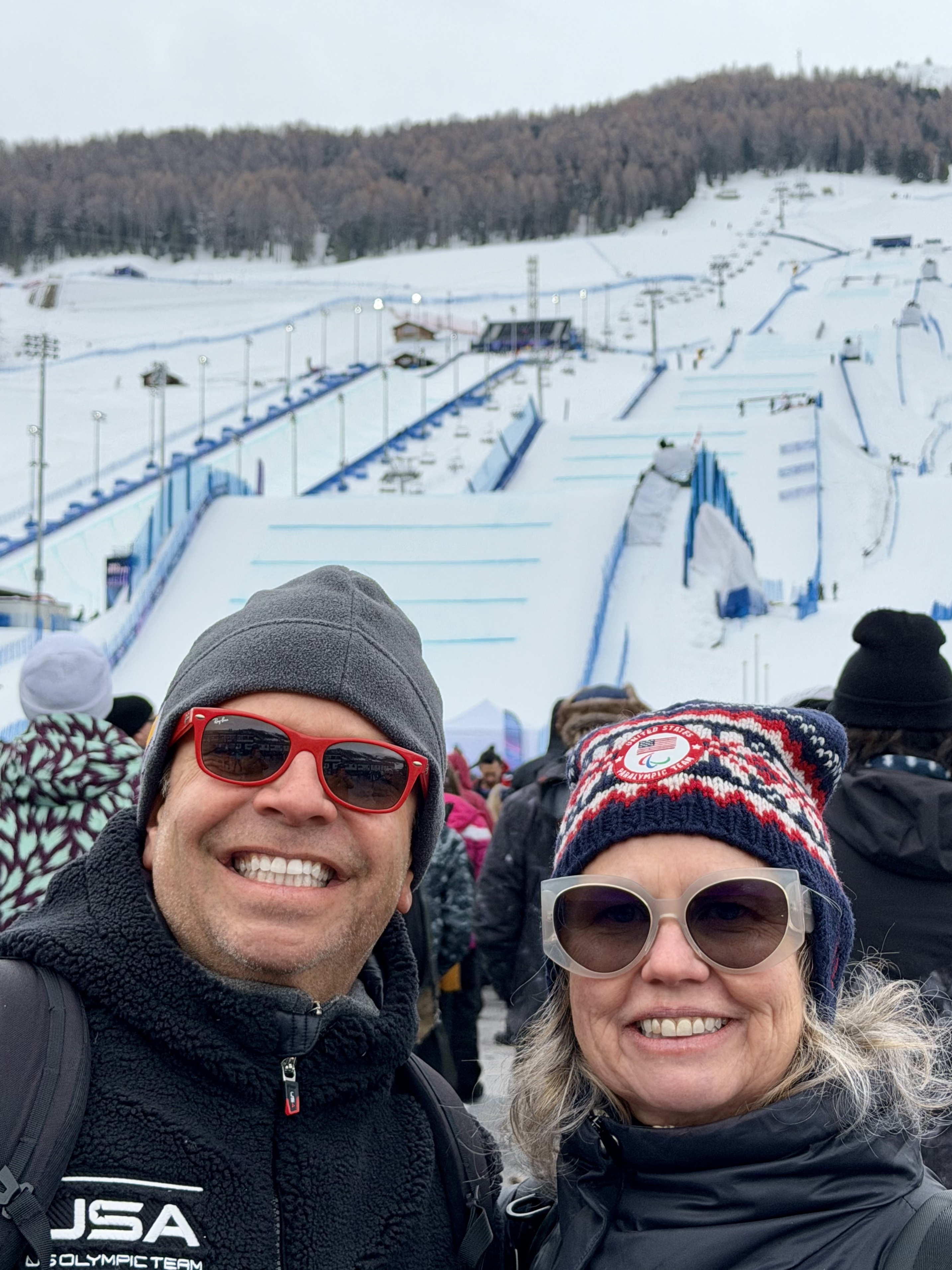 The first view of Livigno is dominated by the huge ski jump, constructed right in the town for the games. To its left is the mountain with runs for freestyle and snowboarding. WOW! We will be standing near the bottom, with hundreds of others – again the people watching is fun – with a great view of the giant video screen. Family/friends/fans are from all over the world, many wearing flags or gear of their country. Music is blaring, the crowd is dancing, cheering, laughing. Such a happy place full of kind and caring fans.