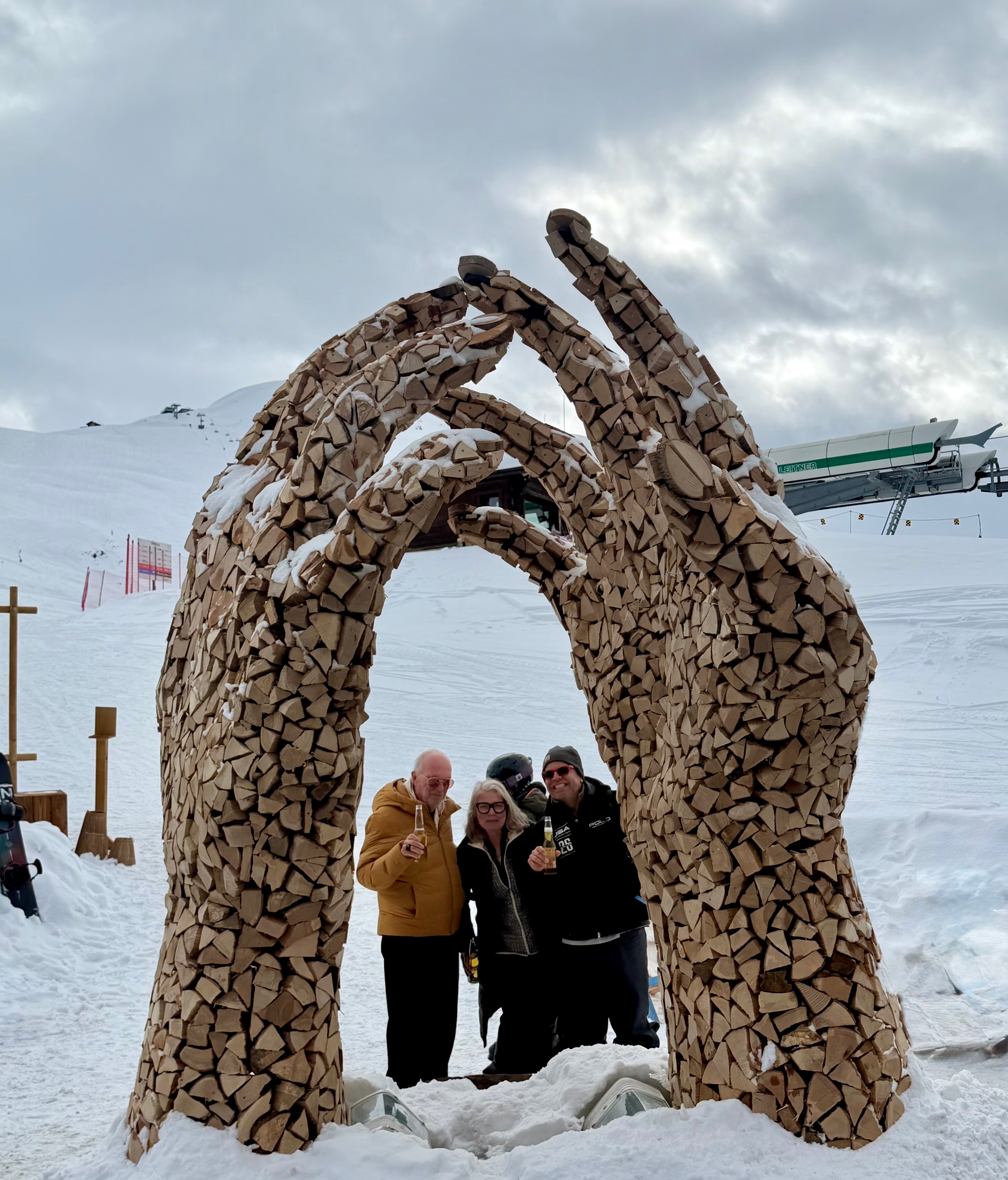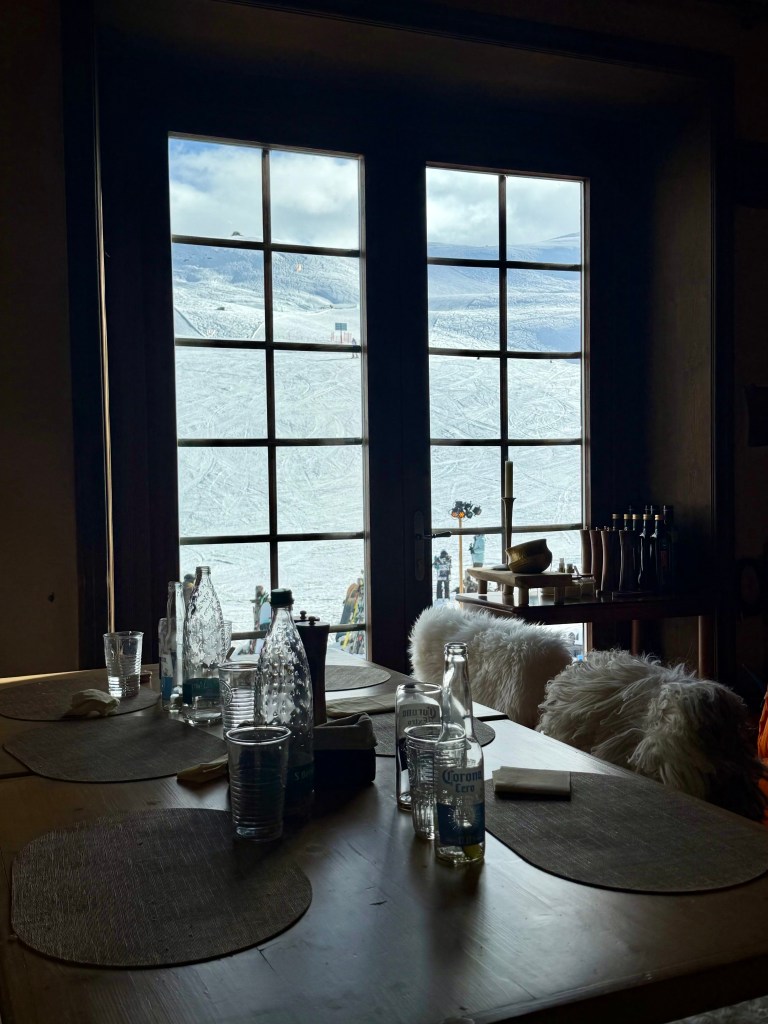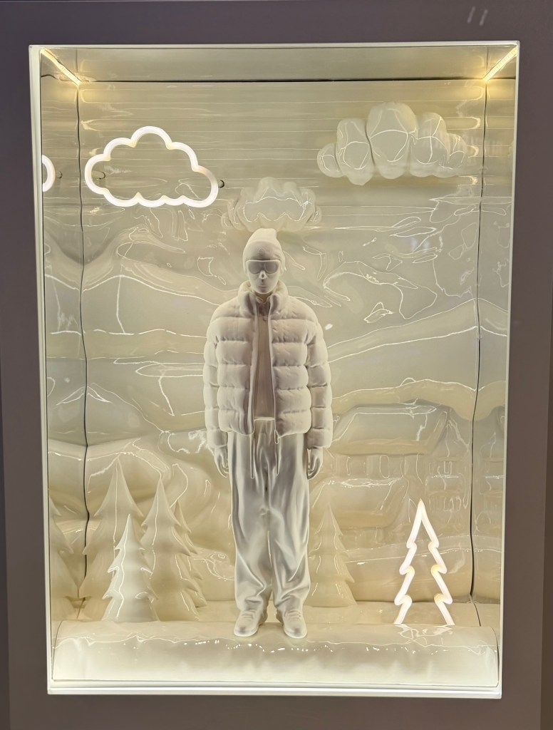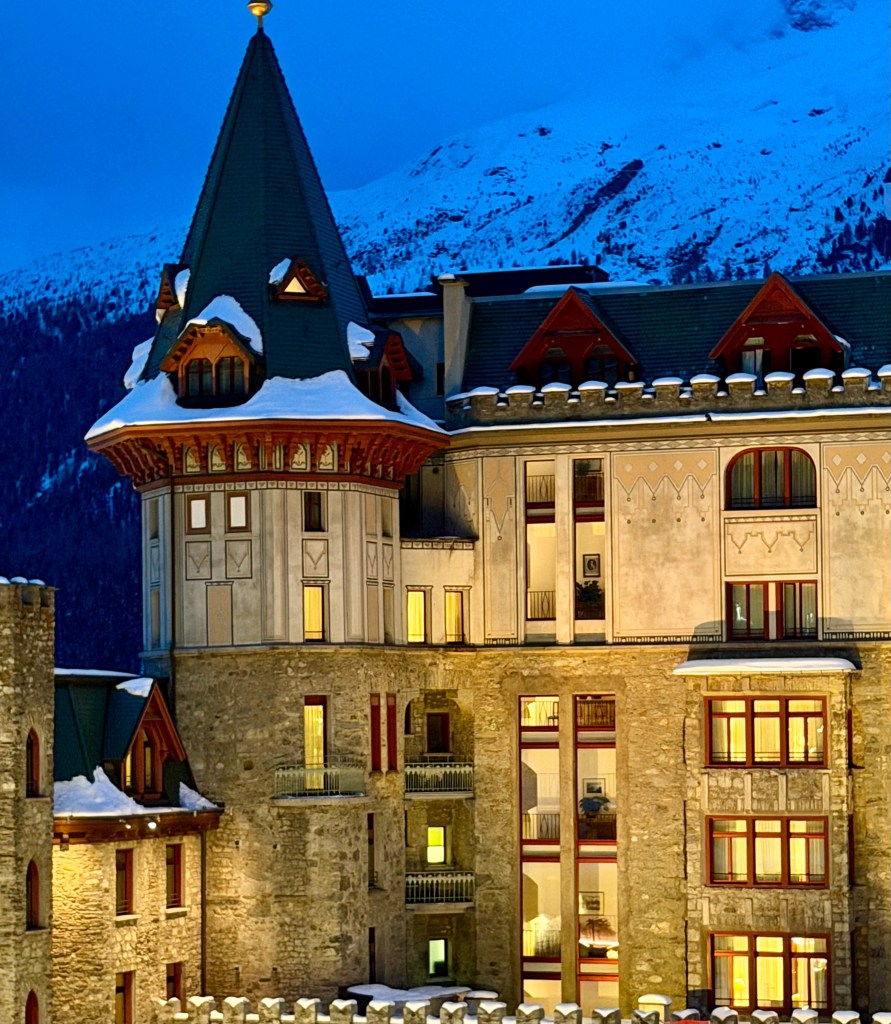 For the late afternoon return to St. Moritz, we are made aware that the tunnel (and the shortcut home) is closed to private travel. The alternate route home takes 2 hours, 45 minutes. We are home in time for Jonathan to get a message, while Paige and I go shopping. A very, very long escalator takes us from our hotel into the heart of the village. The shops are a mix of the traditional high-end fashion shops together with local stores. We see many beautiful things, especially in the “Montclair” ski outlet. My nephew Sean Thomas, a fashion photographer based in Paris, just did an incredible photo shoot in Aspen for Montclair.